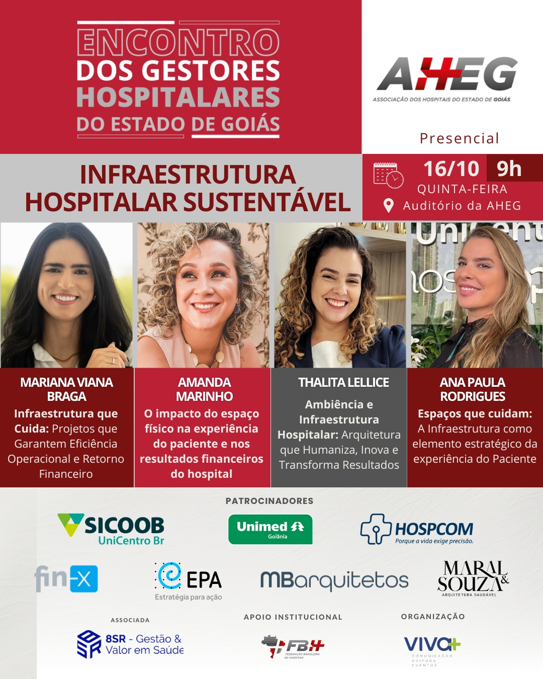 A Associação dos Hospitais do Estado de Goiás – AHEG convida você para o 5º Encontro dos Gestores Hospitalares do Estado de Goiás, que acontecerá no dia 16 de outubro, às 09h, no auditório da AHEG – Alameda Botafogo, nº 101, Centro, Goiânia (GO).