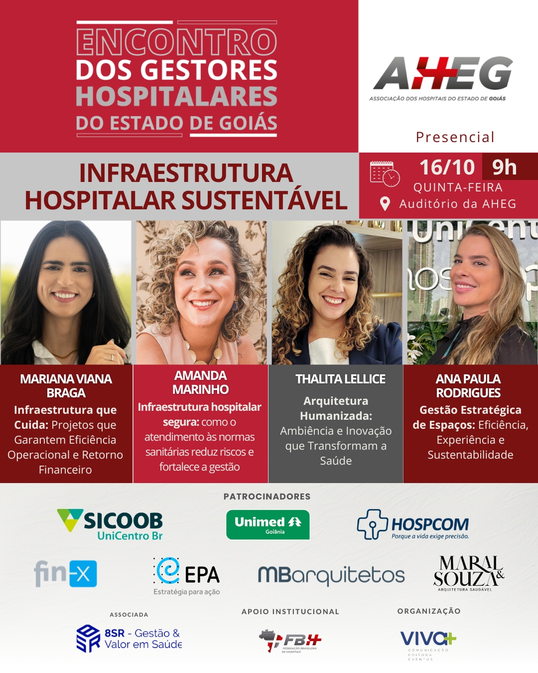A Associação dos Hospitais do Estado de Goiás – AHEG convida você para o 5º Encontro dos Gestores Hospitalares do Estado de Goiás, que acontecerá no dia 16 de outubro, às 09h, no auditório da AHEG – Alameda Botafogo, nº 101, Centro, Goiânia (GO).